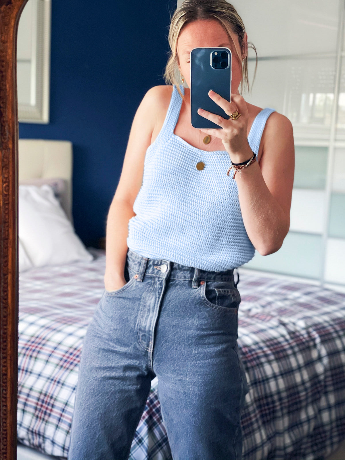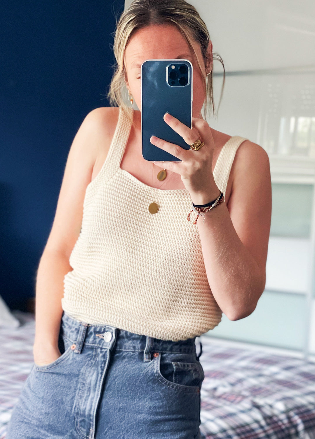 Le Bella Aurora Tee conçu par Alicia Recio est travaillé en coton Pima. Ce projet de crochet de niveau intermédiaire est réalisé en deux pièces de bas en haut en point mousse au crochet. Après que les deux pièces sont terminées, les côtés sont cousus et les bretelles sont ajoutées comme touche finale.