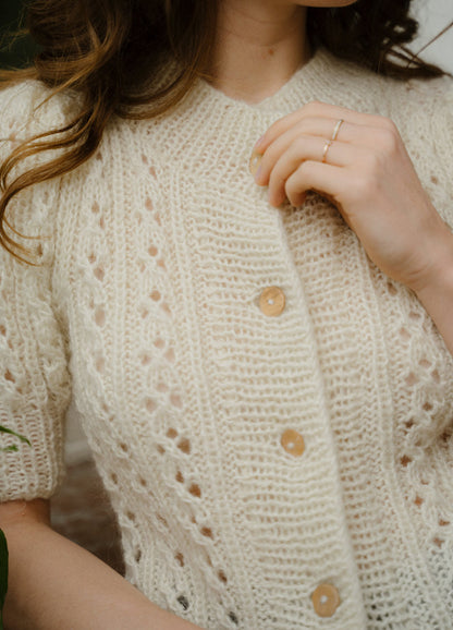 Le Blair Cardigan est un projet de tricot de niveau avancé, présentant beaucoup de dentelle et des manches bouffantes. C'est le projet parfait si vous aimez vous divertir avec chaque point. Le modèle comprend des instructions écrites et en diagrammes. Ce projet se réalise en plusieurs pièces qui sont ensuite assemblées : le dos, les devantures (droite et gauche) et deux manches. Une fois que vous avez terminé de tricoter et d'assembler les pièces, vous ajouterez une bordure sur la longueur du cardigan.