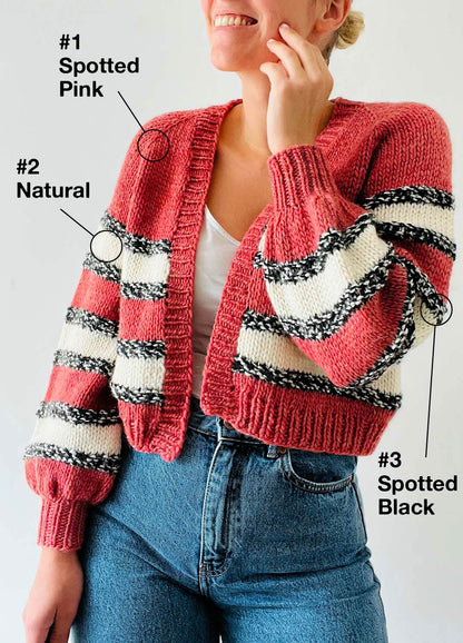Le Kaethe Cardigan conçu par Kolibri by Johanna est un projet de tricot de niveau intermédiaire. Ce projet est travaillé en une seule pièce de haut en bas, à plat et en rond. Vous commencerez par tricoter le corps et les manches ensemble au niveau du cou. Aux emmanchures, le travail est séparé en trois parties : le corps et les manches, qui sont travaillés séparément en rond. Ce projet est tricoté en trois couleurs de The Petite Wool, créant une combinaison de rayures épaisses et fines. Personnalisez votre kit et trouvez votre combinaison de couleurs préférée!