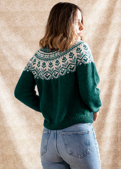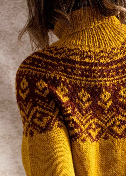 Le Montagne Sweater est un projet de tricot de niveau avancé. Ce projet est travaillé en une seule pièce en rond avec deux couleurs. Il est tricoté de haut en bas, ce qui signifie que vous commencerez par le col, continuerez à travailler l'empiècement en jacquard jusqu'aux emmanchures, puis vous diviserez le travail en trois parties pour travailler le corps et les deux manches séparément. Le travail en couleur est réalisé à l'aide de la technique du jacquard. Si vous aimez les défis, ce projet est pour vous !