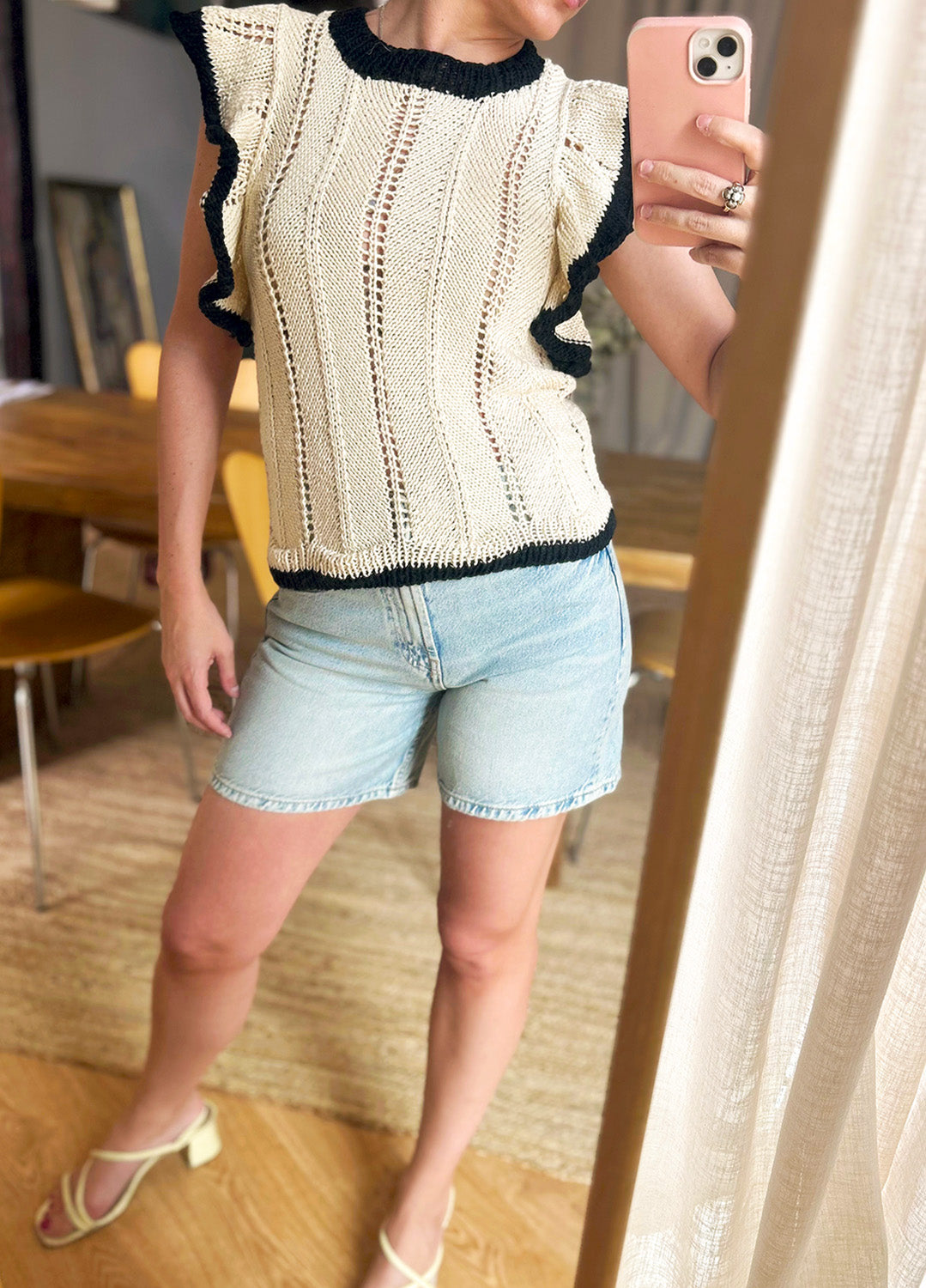 Le Top Ola est un projet de tricot de niveau intermédiaire. Prenez plaisir à tricoter ce vêtement avec des aiguilles à tricoter circulaires et laissez les volants apporter du bonheur à vos journées. Ce projet est tricoté en deux couleurs (A et B) en rond. Le vêtement est travaillé de bas en haut, puis divisé en deux pour travailler les emmanchures et séparer le devant du dos. Une fois le vêtement tricoté, les volants de l'encolure et des épaules sont ajoutés.