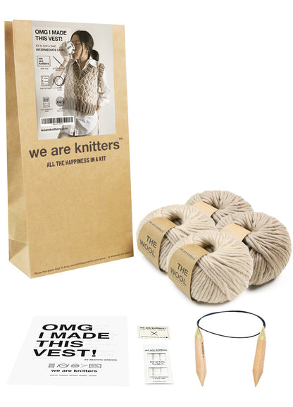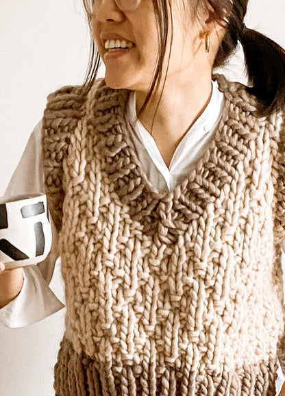 La OMG ! Made this Vest! est un projet de tricot de niveau intermédiaire conçu par Brenda Lam. Ce projet est travaillé en une seule pièce et deux couleurs de laine. La partie inférieure du gilet est travaillée en deux pièces séparées aller-retour, qui sont ensuite jointes et travaillées en rond. Aux emmanchures et à l'encolure, les pièces sont à nouveau séparées et travaillées aller-retour. Une fois le gilet tricoté, des mailles sont relevées pour finir l'encolure et les emmanchures.