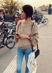 Notre Tinsel Sweater est un kit intermédiaire. Il est créé avec rien d'autre que vos mains, quelques aiguilles et de la patience ! Ce pull est spécial, il a une coupe décontractée accentuée par des manches amples. Portez-le avec un pantalon ample pour jouer sur les proportions.